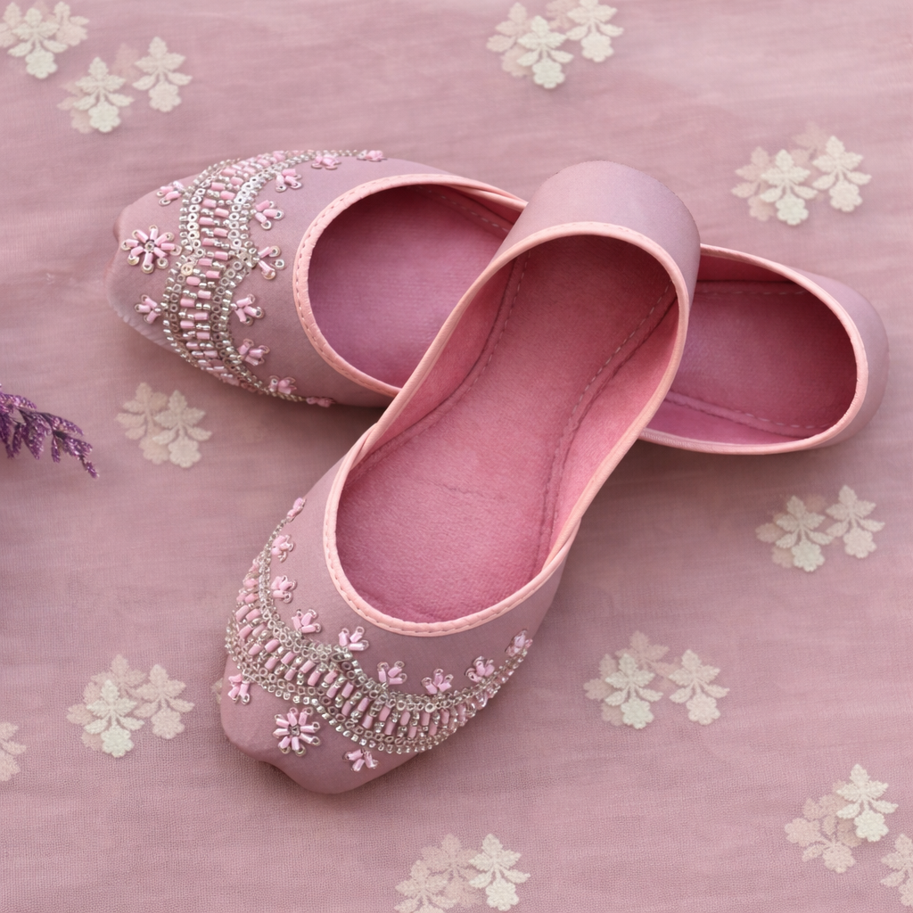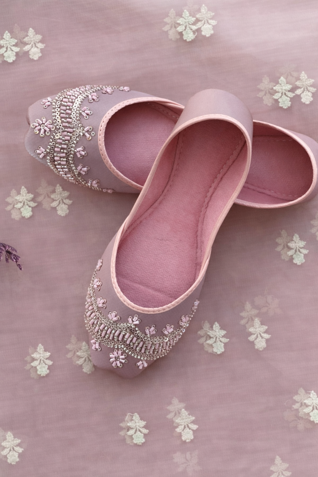 A refined mauve-pink khussa designed for formal wear and festive occasions. The upper features detailed hand-embellishment with soft pink beads, crystals, and metallic accents arranged in floral and curved patterns. The interior is cushioned for extended wear, with a smooth lining that reduces friction and maintains shape.